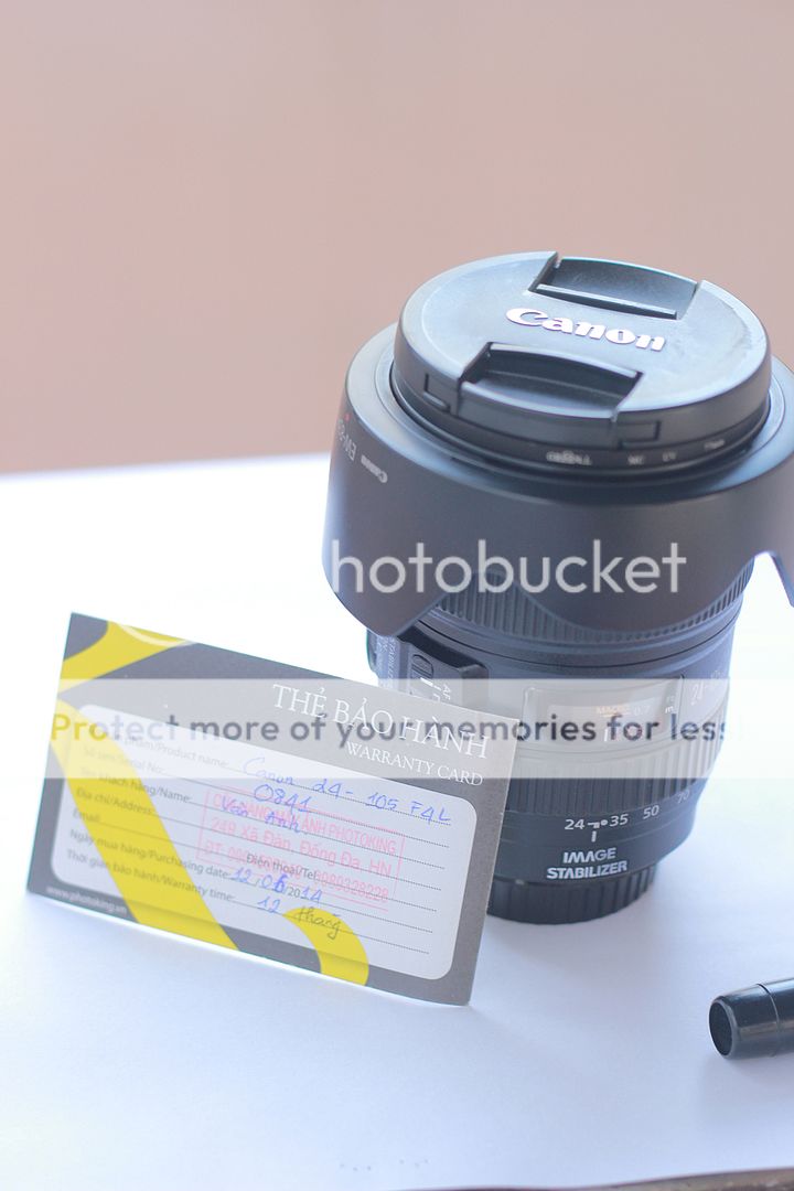Như tiêu đề mình cần bán giúp cho cô em gái ống kính canon 24-105 F4L, lens mua mới tinh kong kong ở PhotoKing, mới hết BH hồi tháng 6, tất cả mọi thứ đều nguyên bản, thẻ bảo hành chính chủ, đầy đủ cap trước, sau. Do chủ yếu chỉ chụp hội nghị trong phòng và họp báo trong hội trường, chả mấy khi mang ra ngoài nên lens cực đẹp, thấu kính trong vắt, ko một hạt bụi gì luôn, vòng zoom và focus vẫn rất mượt, không lỏng lẻo hay trồi ra khi úp ống kính xuống, cap trước hơi trầy do khổ chủ hay để linh tinh (khoản này bó tay ^^). Lens chỉ bảo quản trong tủ chống ẩm tại cơ quan.