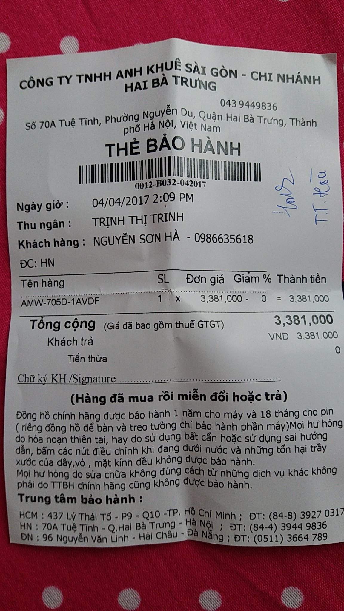 Như tiêu đề. E cần bán e Casio Hunting Time AMW-705D. mới mua ở Anh Khuê 1 tháng. bjo đeo cảm thấy ko hợp tay nên muốn bán cho bác nào cần. hộp sách thẻ bh đầy đủ. bao check các thể loại luôn. Giá 3.000.000 Bác nào quan tâm alo: XXX