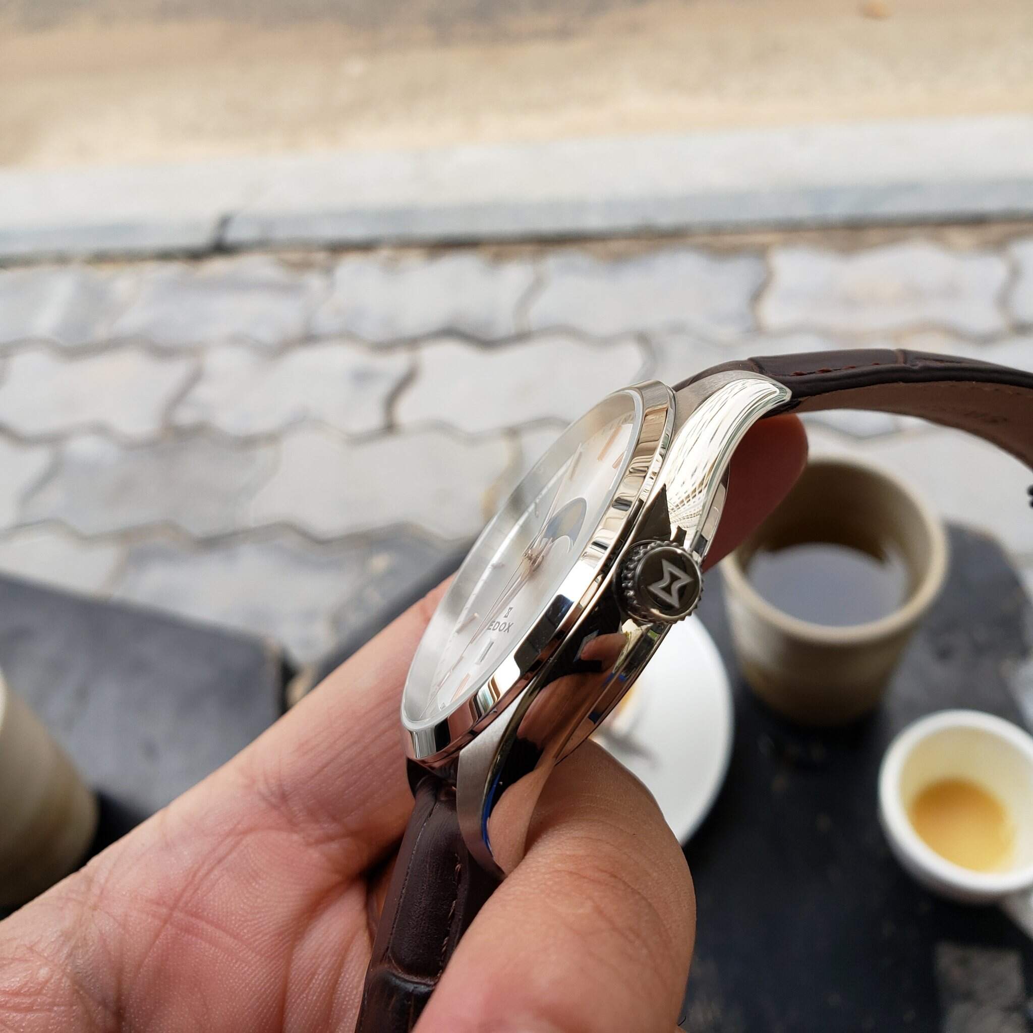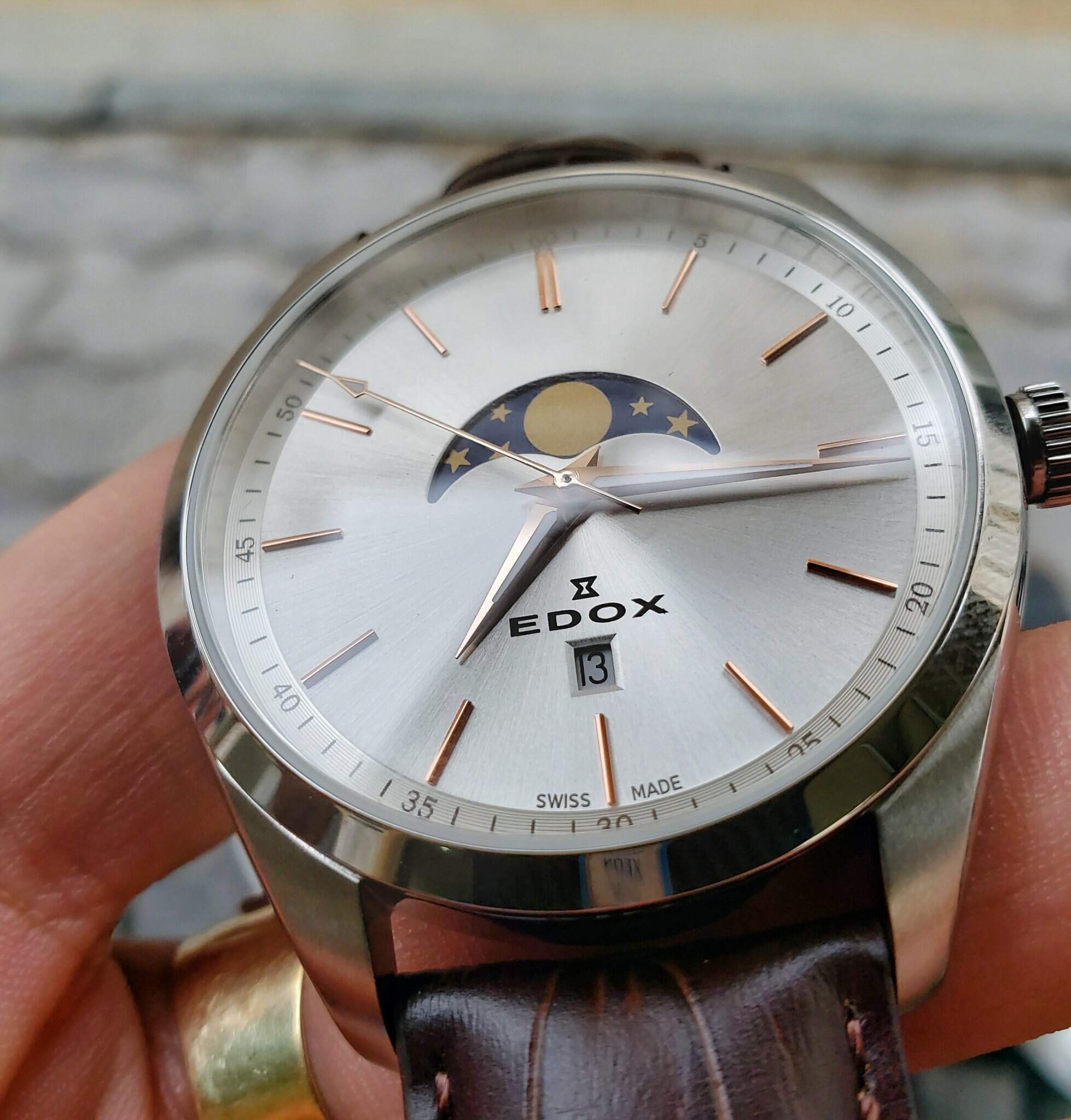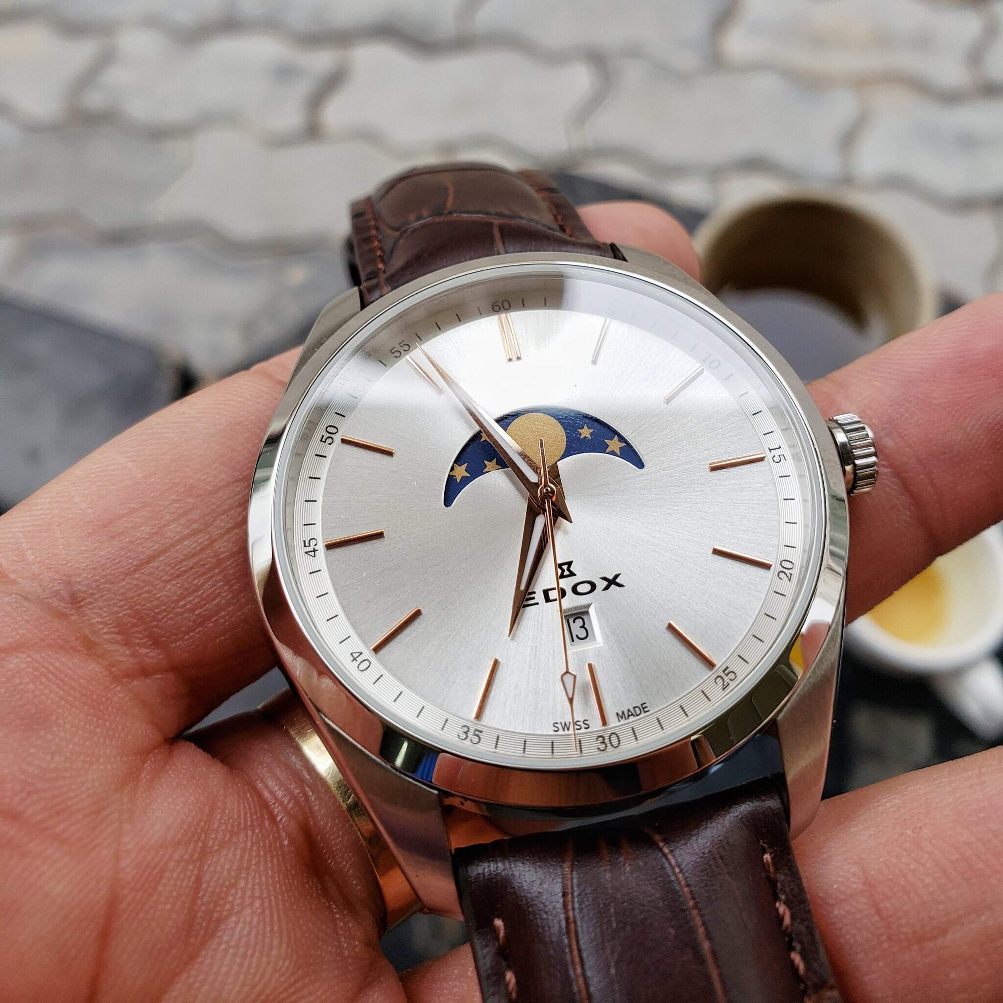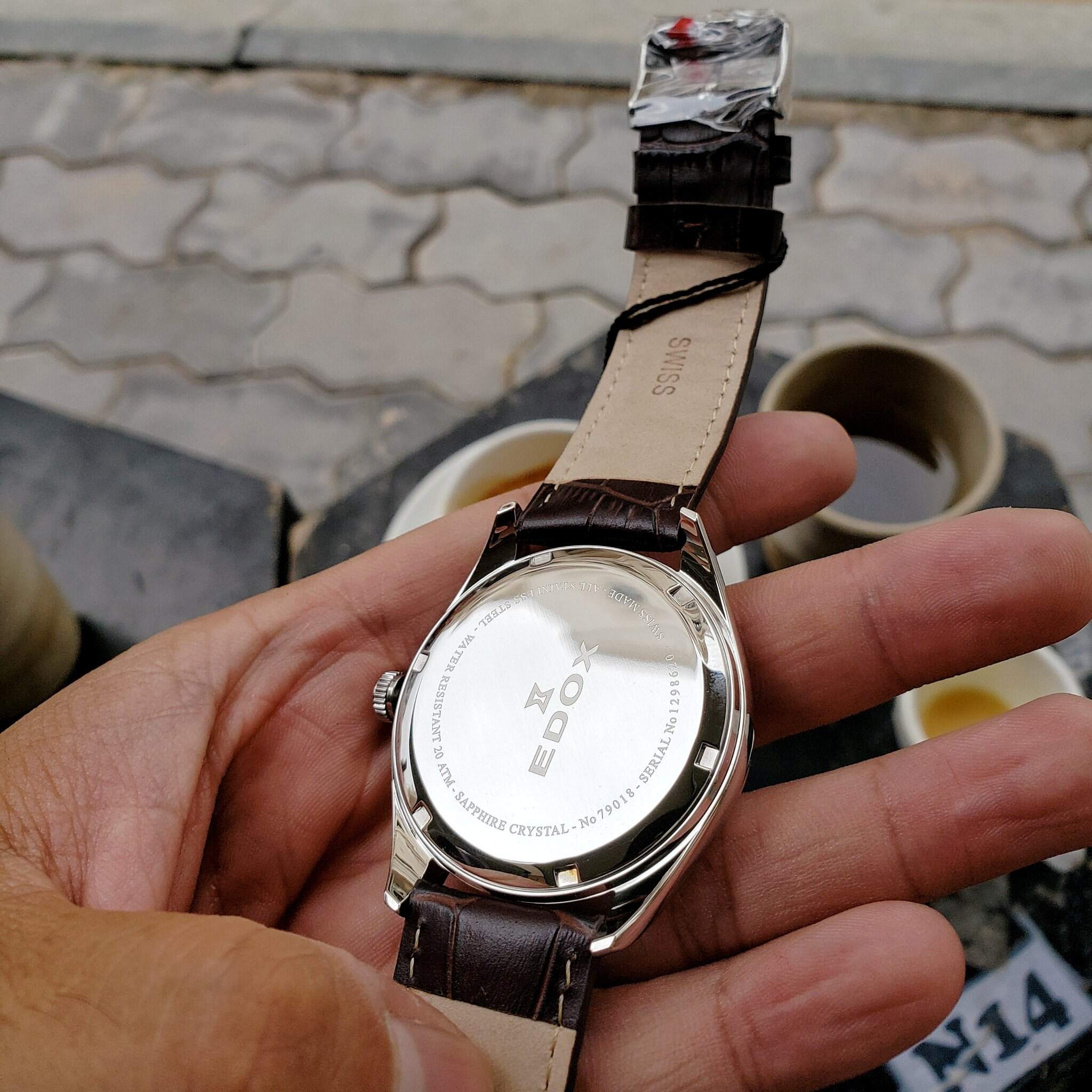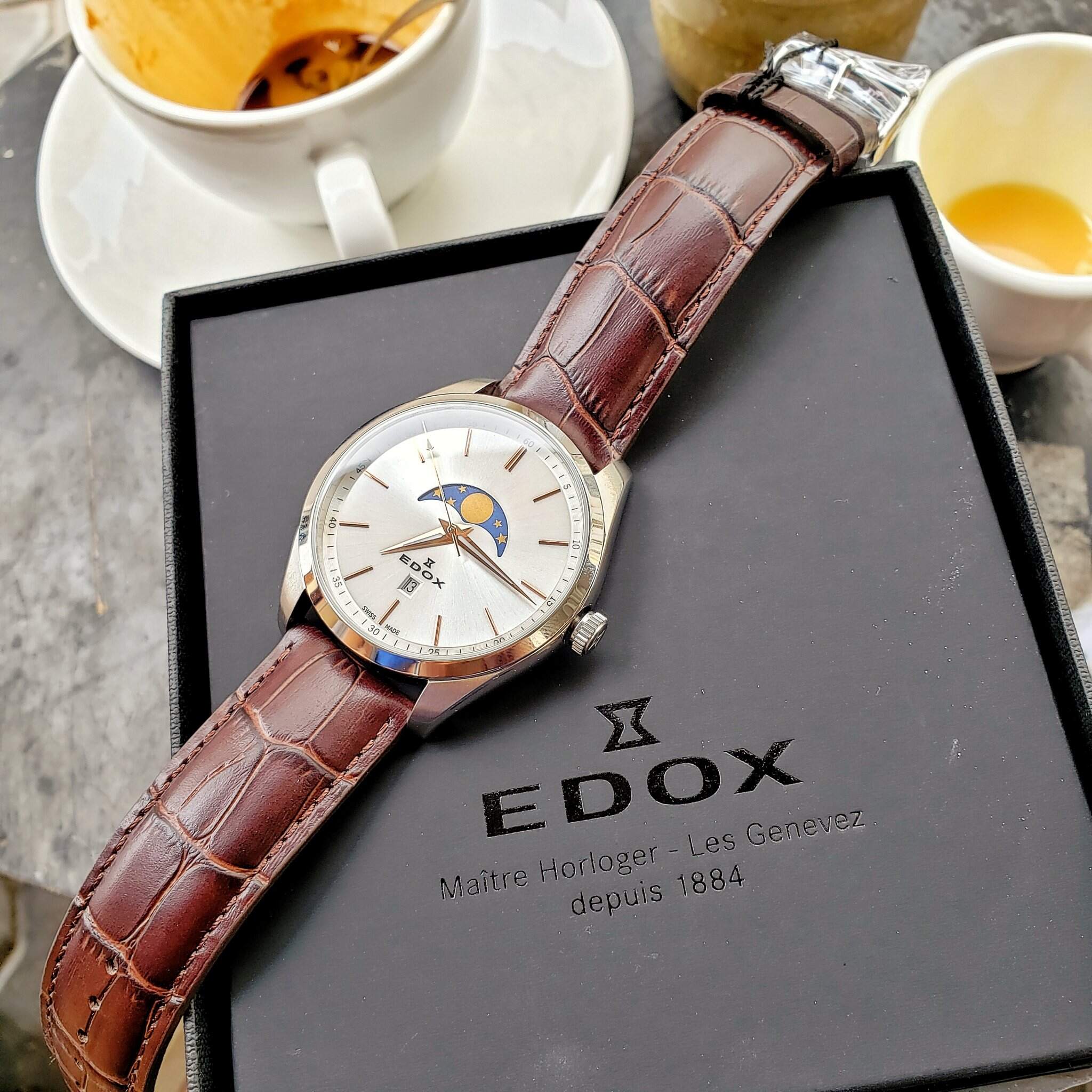 Edox Quartz MoonPhase Kính Saphire nguyên khối Chống nước 200mSize 42mm Lug cụp nên tay nhỏ 15.5 trở lên đeo đẹp Fullbox mới 100% ship store US Giá Retail hãng hơn 600 USD Fullbox đầy đủ hộp thẻ tag Giá chỉ vài triệu cho 1 em Swiss made Tel XXX