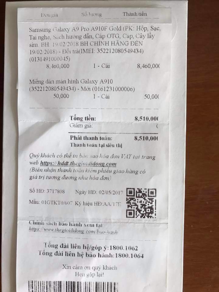 Cần bán 1 DT SamSung A9 Pro mua ngày 2/5/2017 tại TGDD. Tình trạng còn mới 99%. Bảo hành chính hang đến tháng 2/2018. Giá bán 6tr8 + Tặng bao da Bluemoon Lesanh (300k). Lý do bán: Dt to và nặng, bị đau tay khi sử dụng nên bán lại.