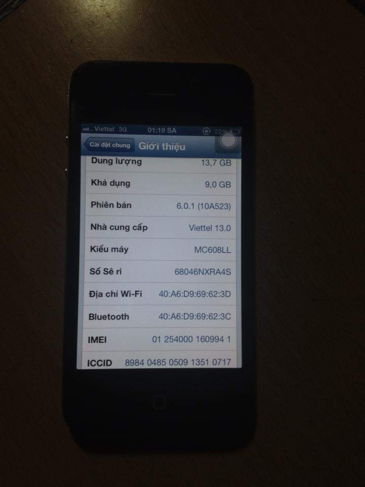 Đăng hộ em gái mình con iphone 4 black bản quốc tế nhé. Chi tiết các bác xem ảnh dưới. Máy hơi xước 1 tý viền nhôm còn lại ok hết, mới tầm 97% nhé các bác. Đang chạy 6.0.1 em thấy jailbreak rồi nên chắc là có shsh luôn rồi. Giá 5tr9 no fix vì em bảo nó là đc giá đấy rồi, con trai kì kèo cũng ngại. Các bác mua đc giá đó thì liên hệ sdt 0165.6730.352 nhé, số của nó đấy ( xinh lắm ) =))). Mua về mà thấy xinh thì rep nhá :)), ảnh điện thoại đây các bác. Phụ kiện sạc + máy ;) 942065_493623080711683_1792832245_n.jpg 969817_493623424044982_98057796_n.jpg 942216_493623497378308_1197390108_n.jpg 580211_493623357378322_1848749823_n.jpg 65636_493622990711692_1979462908_n.jpg 936725_493623230711668_176801705_n.jpg