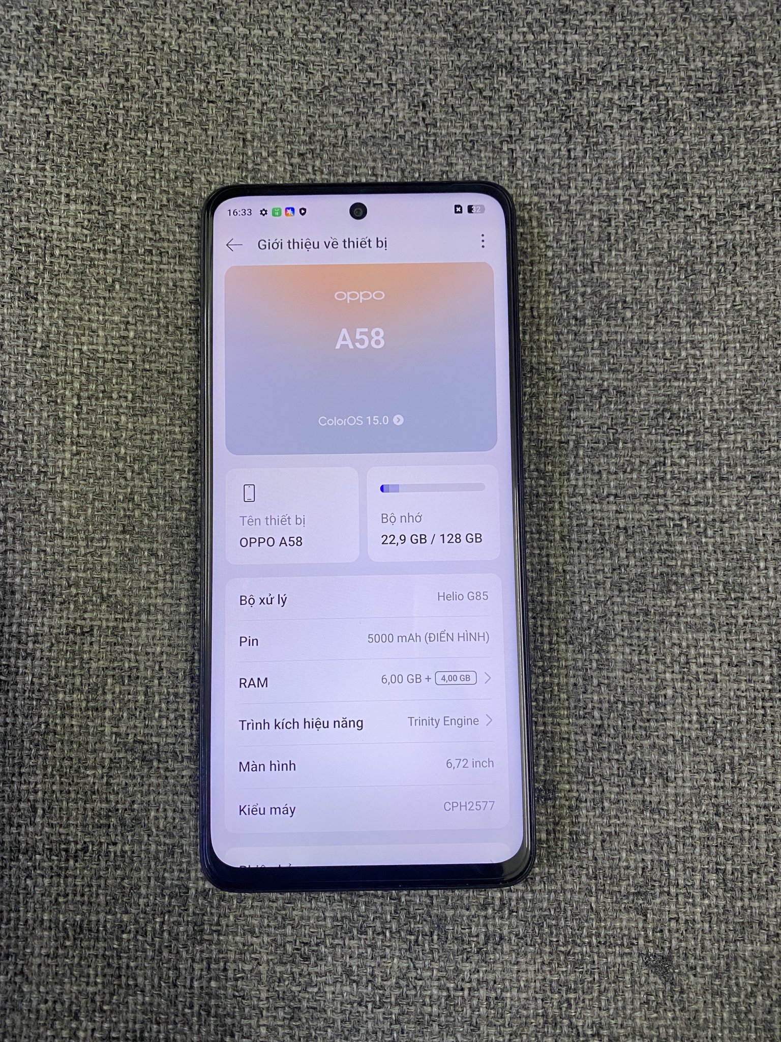 Máy màu đen đẹp , màn hình đã dán kính cường lực . Máy còn bảo hành tới 30/07/2026 , Chip Helio G85 , Ram 6Gb . Pin 5000mAh .