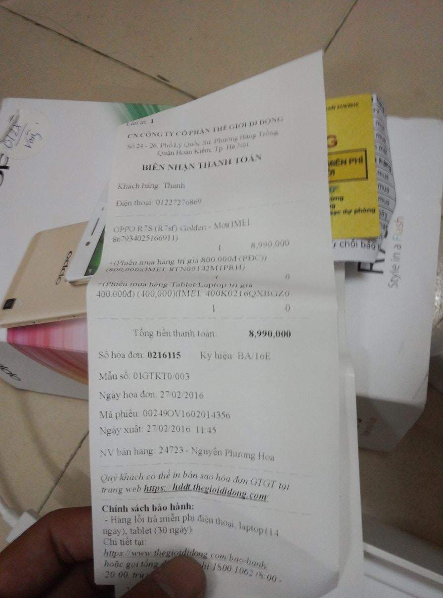 Ông anh mình mới lên đời máy nên có nhu cầu bán lại điện thoại Oppo R7s mua tại Thế giới di động, còn bảo hành dài đến tháng 2/2017