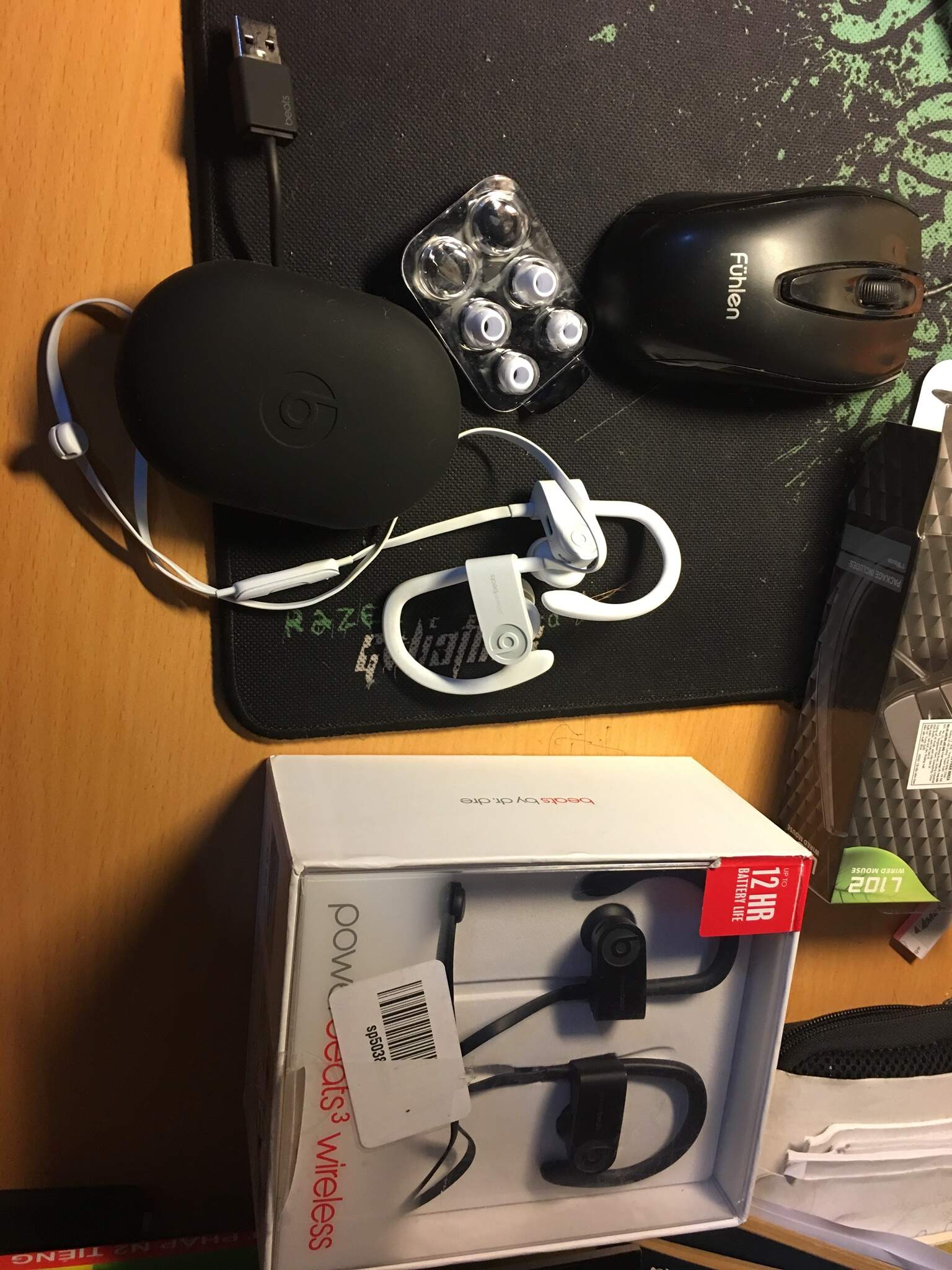 mình bán 2 chiếc powerbeats 3. 1 chiếc màu đen mới 99,9%, chỉ mở ra check chưa dùng, phụ kiện để nguyên trong hộp, giá 2m5. 1 chiếc màu trắng full phụ kiện ko hộp mới 99% giá 2m