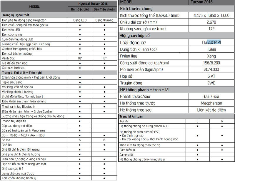 Hyundai Tucson 2016 là thế hệ thứ 3 có mặt tại thị trường Việt Nam vào cuối năm 2015. Với những thay đổi, nâng cấp mạnh mẽ từ thiết kế ngoại thất cho đến trang thiết bị tiện nghi, động cơ cùng khả năng vận hành… Phiên bản đặc biệt của Tucson 2016 được trang bị khá phong phú với cửa sổ trời toàn cảnh Panorama, phanh tay điện tử, cốp sau đóng mở điện thông minh, la-giăng 19 inch mặt cắt kim cương – những thứ không có trên các đối thủ khác trong phân khúc.