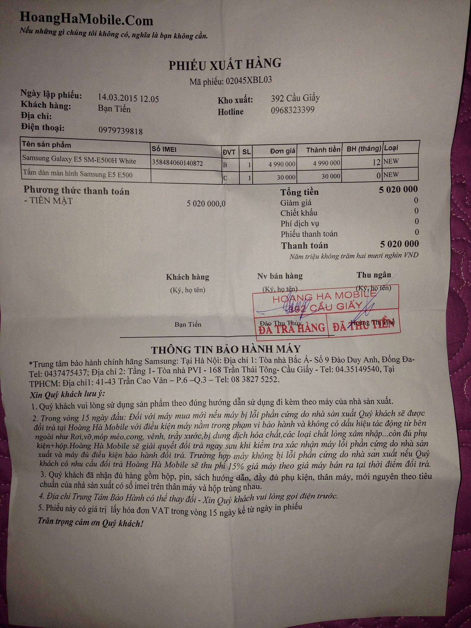 Em vừa mua 1 chú galaxy E5 tại Hoàng Hà hôm qua 14/3,