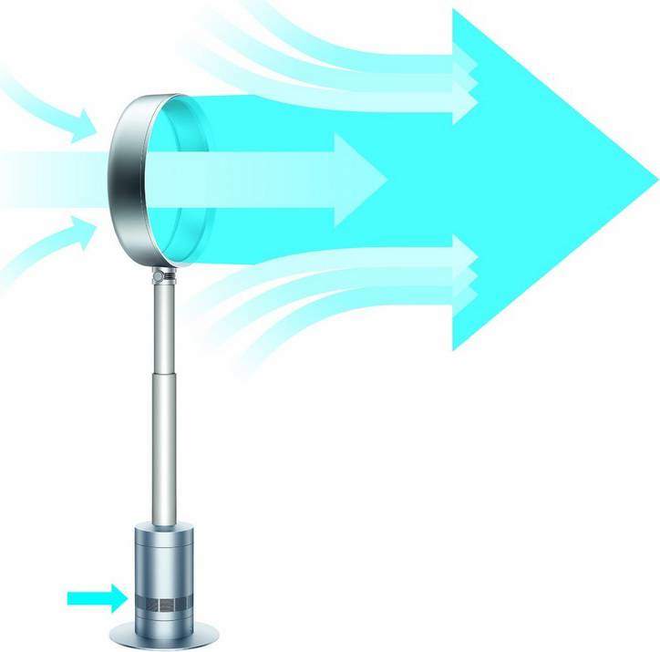 Quạt sử dụng nguyên lý hút và đẩy gió của động cơ máy bay giúp luồng gió đều, không bị ngắt quãng như dòng quạt cánh. Ngay cả khi bạn để quạt hướng trực tiếp vào mặt, cũng không gây cảm giác ngặt hay khó chịu.