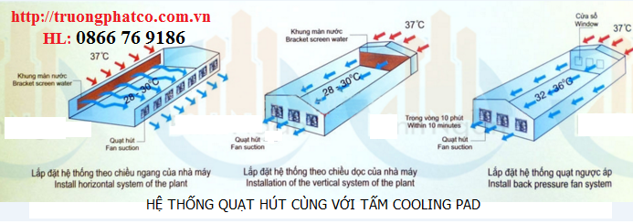 Dùng tấm làm mát cooling pad kết hợp với quạt hút ngược áp tạo áp suất âm hút không khí được làm mát vào trong không gian .Nước được tưới qua tấm làm mát , không khí đi qua tấm làm mát này đi vào sẽ có nhiệt độ thấp hơn 3-5 độ so với nhiệt độ ngoài trời .Quạt hút ngược áp ở đầu bên kia sẽ hút không khí ra ngoài giúp không khi được làm mát luân chuyển khắp không gian sử dụng .Loại này dùng cho không gian tương đối kín như xưởng may , xưởng dệt , xưởng giầy hay những xưởng có lượng công nhân nhiều ..