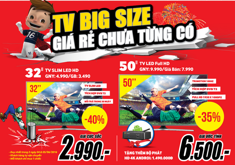* Giải trí bất tận & Cuồng nhiệt cùng EURO 2016 ngay tại gia với TIVI BIG-SIZE GIÁ RẺ CHƯA TỪNG CÓ !! ☛ Khám phá ngay : http://mediamart.vn/tivi/ * Hoặc gọi : XXX nhánh 1 để được tư vấn