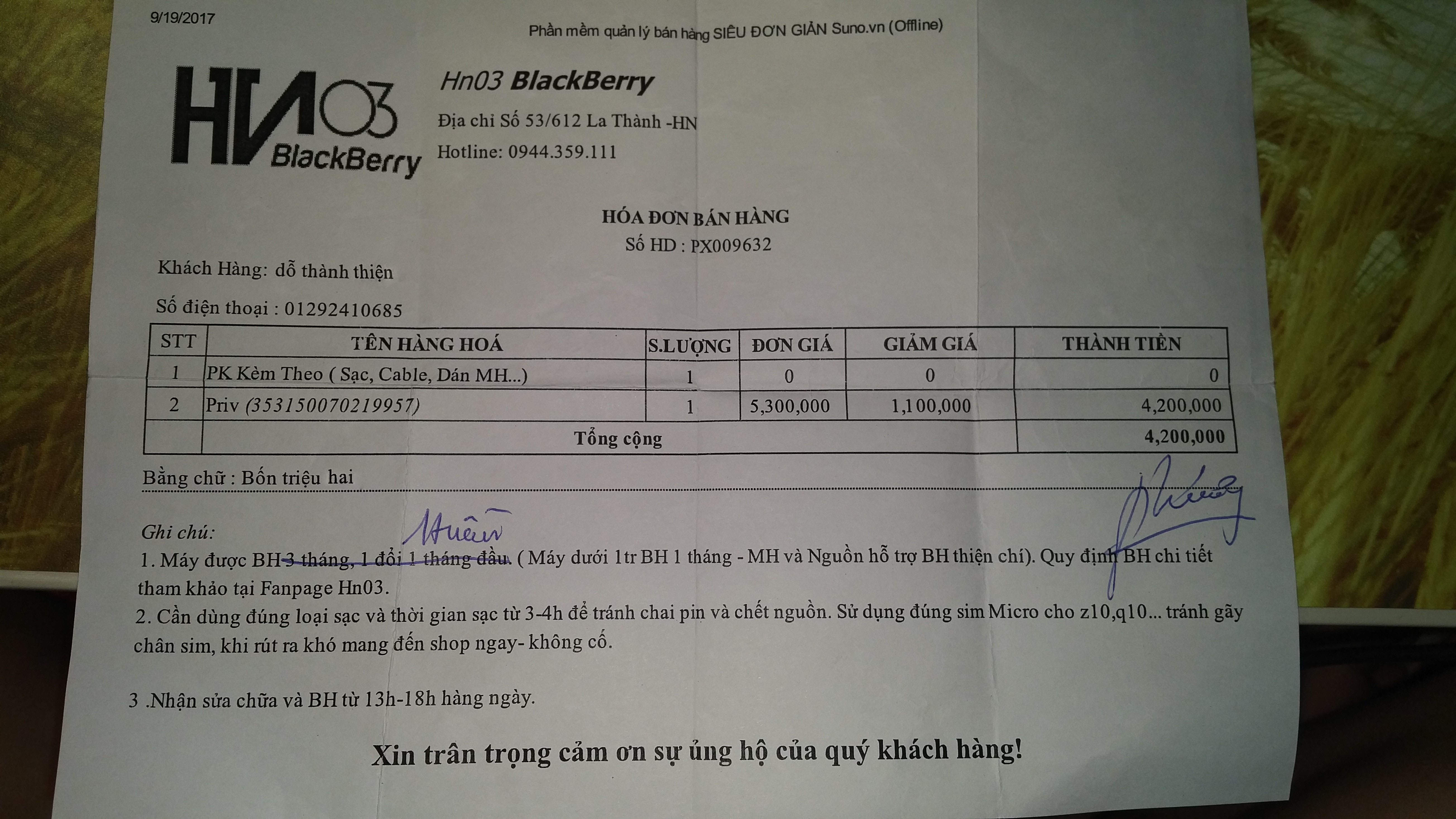 - Các bạn nhìn hoá đơn thì thấy từ 5tr3 giảm 1tr1 còn 4tr2 là vì máy có bị ám nhẹ, nhưng là ám rất nhẹ, chỉ để nền trắng mới thấy chư "blacberry" màu vàng nhẹ, được anh chủ giải thích là do lúc vận chuyển, máy sáng liên tục, lúc đó nghe anh tư vấn con này bị ám nhẹ, về dùng 1 time có khi còn hết mà h 2 tháng vẫn thế ( thấy hời xúc luôn 4tr2, h 2 tháng vẫn thế nên thấy hơi xót ), em không chụp ảnh vệt mờ đc vì chụp đt bt k thấy đc, nhìn trục tiếp mới thấy.