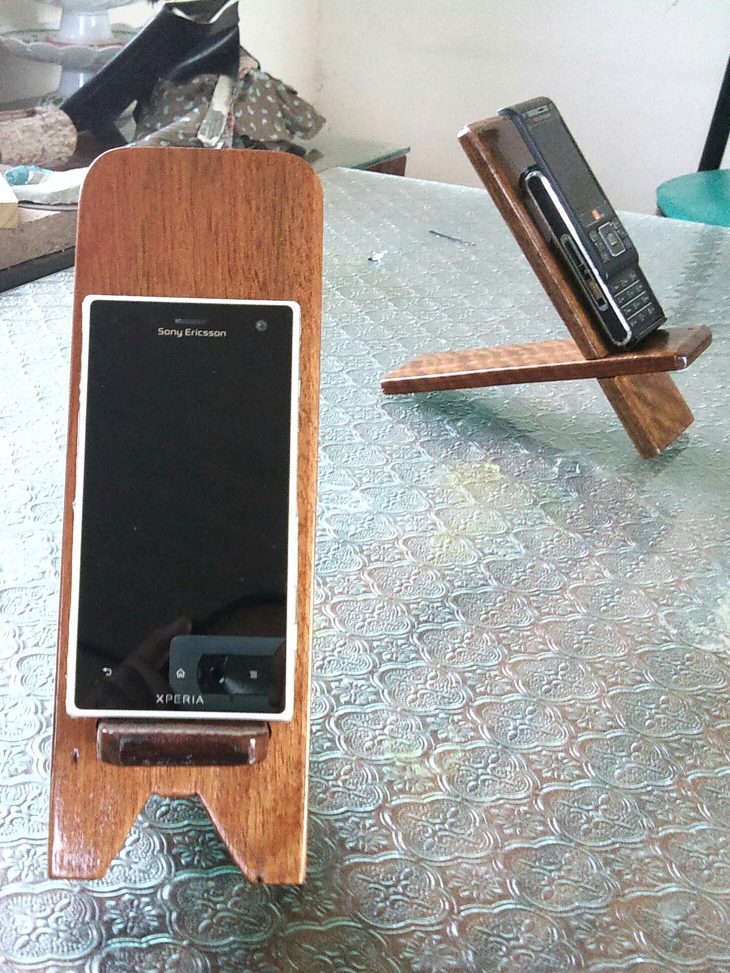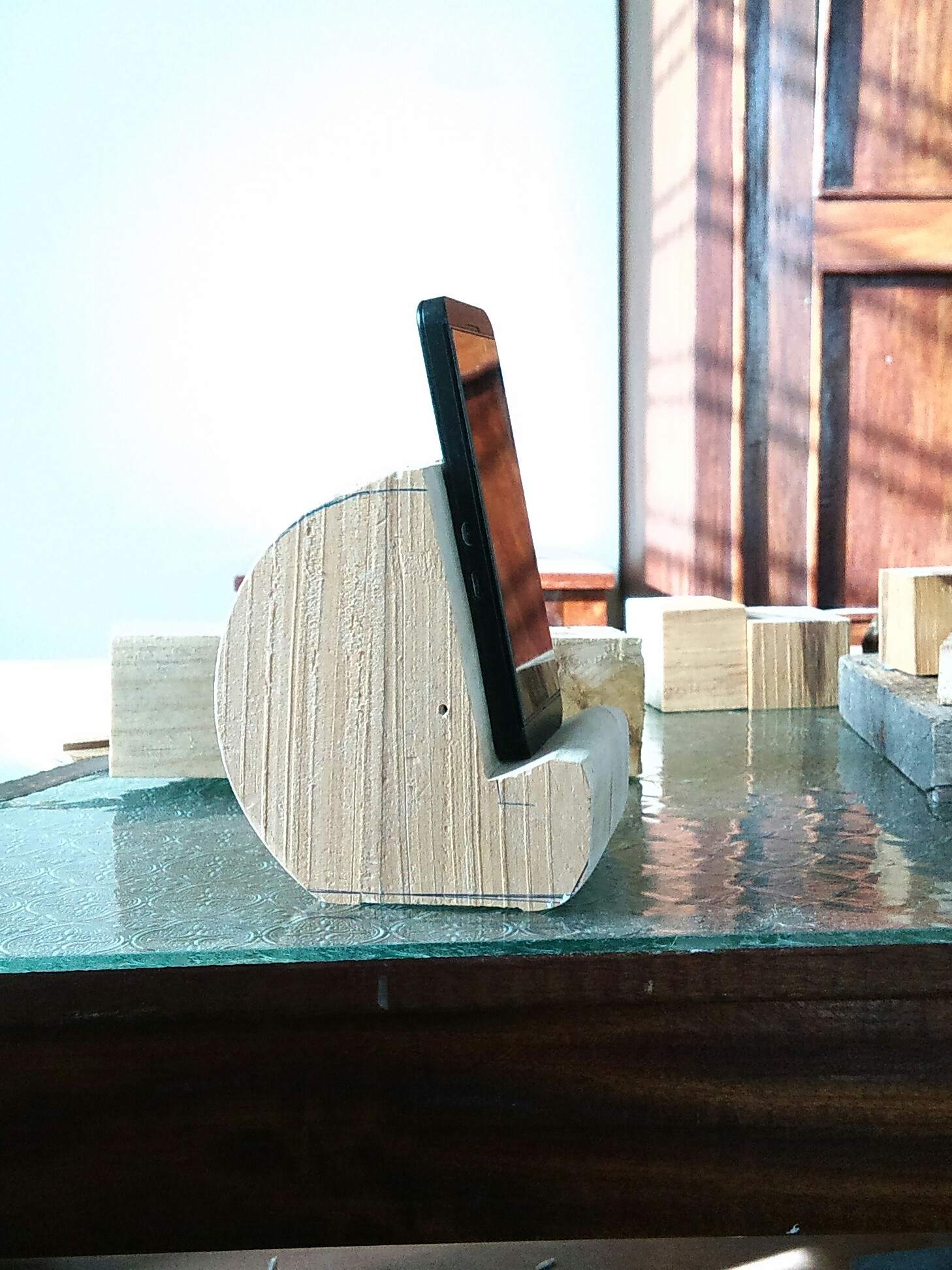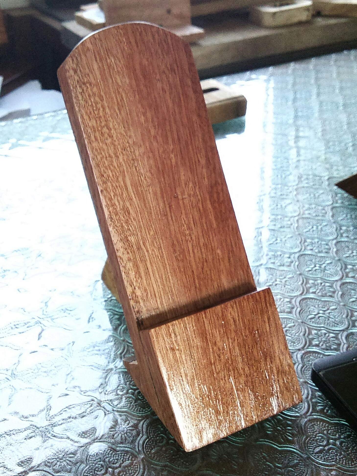 Với ý tưởng của bạn, mình sẽ làm một cái to hơn, vị trị đặt đthoại sẽ rộng hơn để có thể để ipad mini, còn tai nge thì treo ở trên ốp vào 2 bên sườn Đế gỗ, còn lỗ sạc thì khoan xg dưới và dẫn dây vào từ phía sau. Ngay tại vị trí trc chân tựa đthoại bạn có thể yêu cầu khắc chữ, hình cho đẹp.