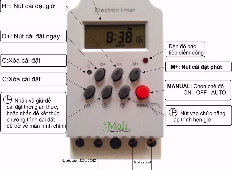 - Thực hiện theo trình tự các bước sau đây, Quý khách sẽ cảm thấy dễ dàng khi sử dụng bộ hẹn giờ đa năng này.