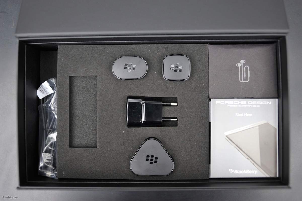 P'9982 được đựng trong một chiếc hộp giấy màu đen khá to, nó có cùng cách đóng gói với những đồng hồ hoặc sản phẩm nào đó rất cao cấp. Phụ kiện bên trong chỉ có những thành phần cơ bản như sạc, dây kết nối, tai nghe, sách hướng dẫn nhưng BlackBerry đã làm chiếc hộp khá to để tăng độ sang trọng cho smartphone này. Trong hộp chúng ta có tới 3 cục sạc theo các chuẩn khác nhau cho nhiều thị trường bao gồm sạc hai chấu và ba chấu.
