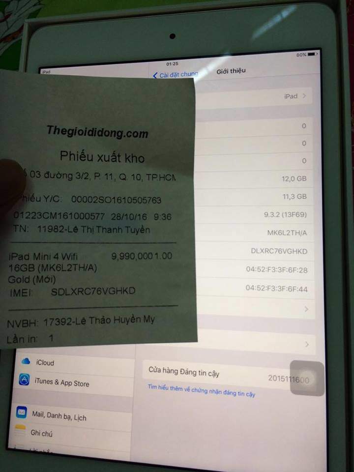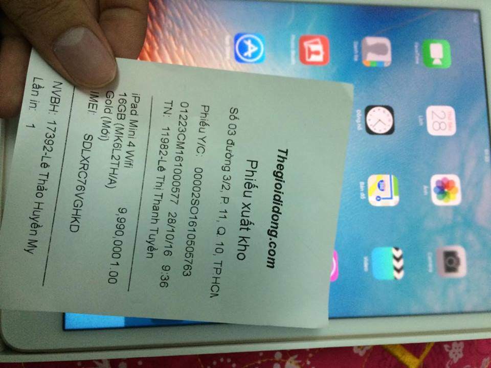 Mình cần bán cây ipad mini 4 16gb wifi này lại vì mua về mẹ ko cho xài . Mới mua hồi sáng o TGdd luôn có giấy xuất kho như trong hình . Chưa làm gì luôn chỉ mới kích hoạt để test tại cữa hàng . chưa đang nhập icloud , ... Máy new 100% . Bảo hành 1 nam , 1 đổi 1 nếu máy lỗi trong 1 tháng . Mình chịu lỗ 600k :((( . Bán lại 9tr4 có thể fix xíu nha huhu . Alo mình nha
