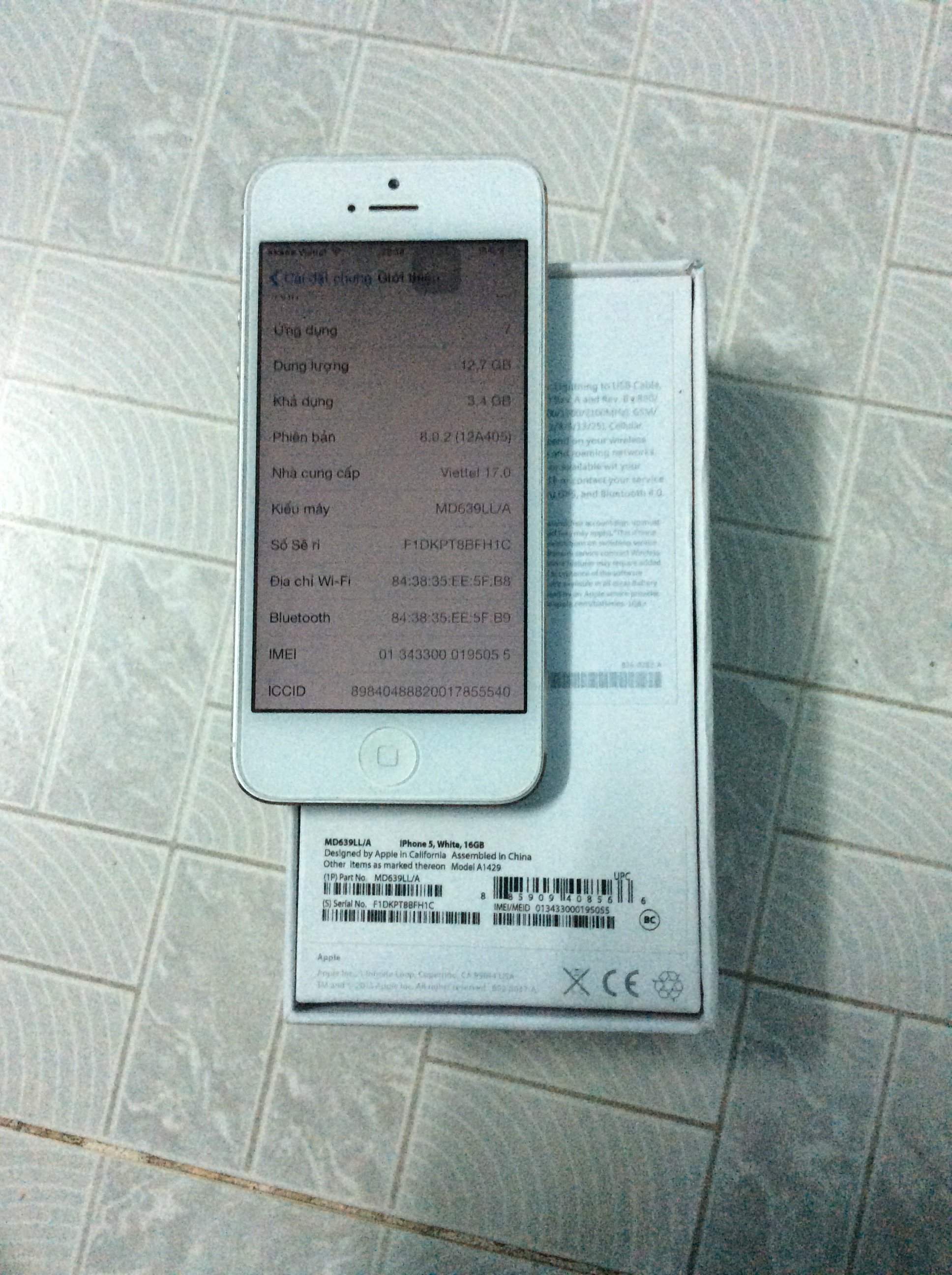 Mình được nguời thân bên Mỹ gửi về 1 iphone 5 white QT 99% mới được 1 tháng,máy mình đang xài rất ổn định.đã up lên 8.0.2. Máy còn rất mới.