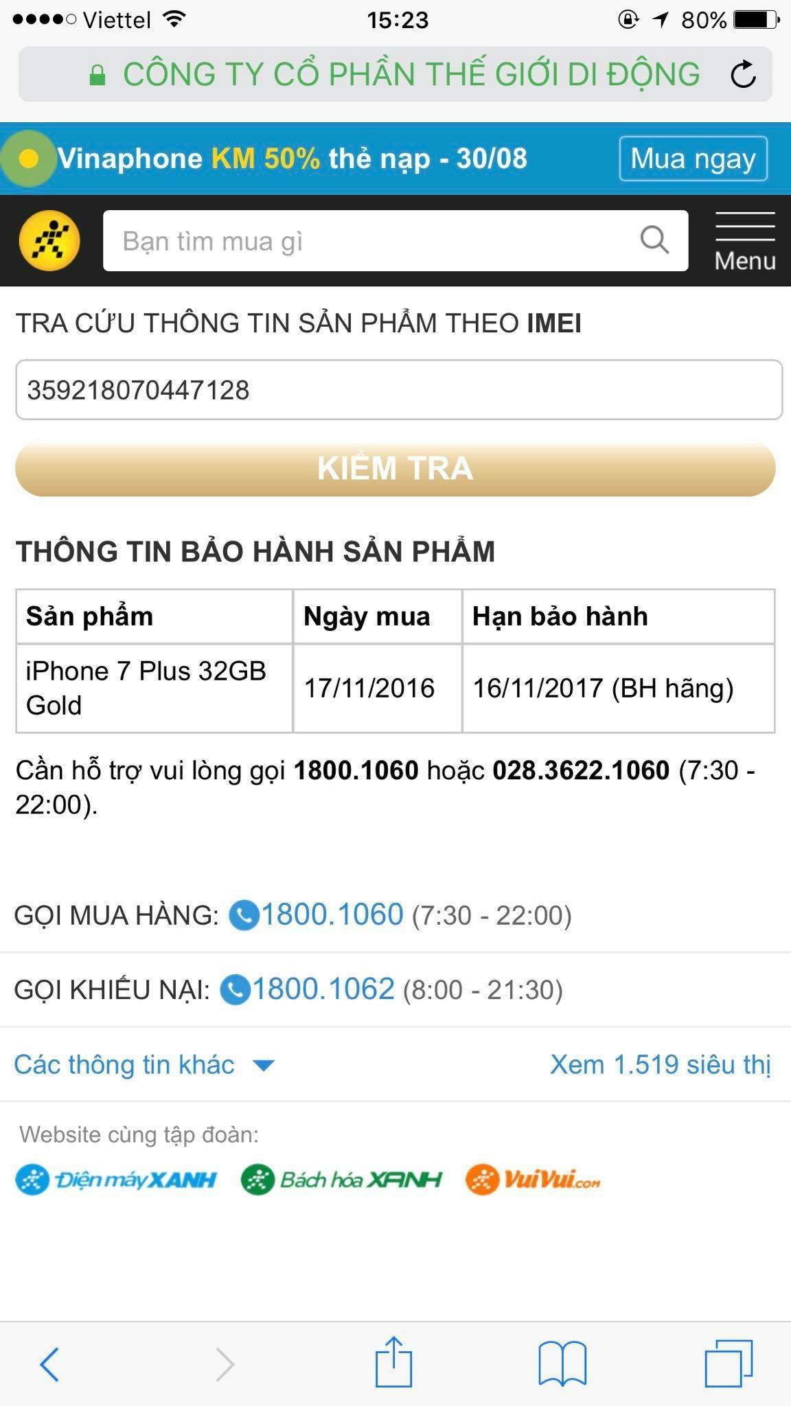 IPhone 7 plus 32 Gold mua tại TGDD. Máy còn bảo hành đến 11/11/2017. Máy hình thức đẹp like new như máy mới, Fullbox đủ phụ kiện zin theo máy. Pin còn chưa chai, mọi chức năng đều sử dụng mượt mà, nhanh nhạy.