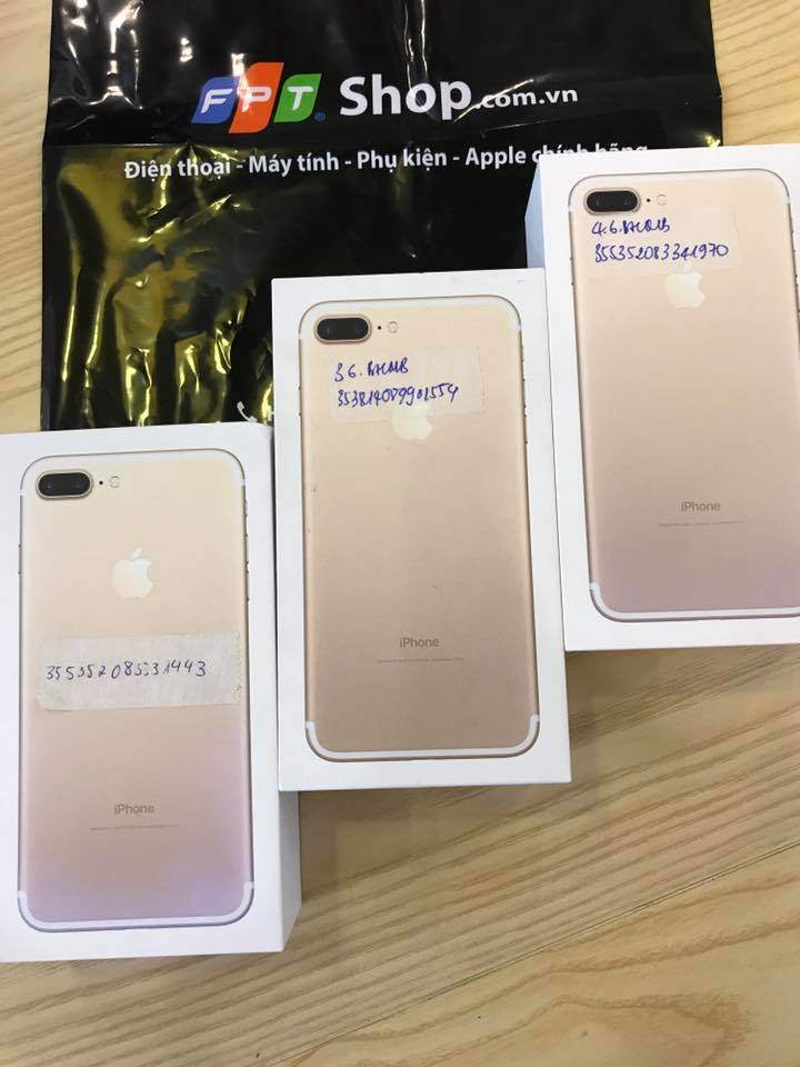 - 3 bộ iPhone 7 Plus Gold 128GB máy chính hãng FPT mã VN/A vừa đổi bảo hành về. Mới 100% nguyên seal máy chưa active, full box pk zin chưa sử dụng. Kích hoạt lên còn bh 1 năm 1 đổi 1 tại FPT tới T5/2018