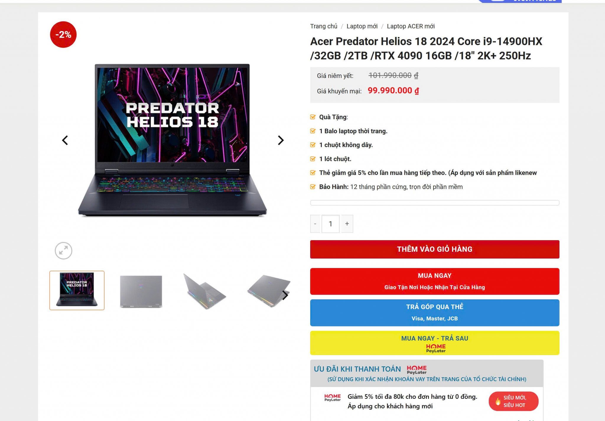 Laptop Acer Predator Helios 18 Core i9-14900HX | 32GB | 2TB | 18 inch 2K+, 250Hz | RTX 4090 | Win 11 Fullbox