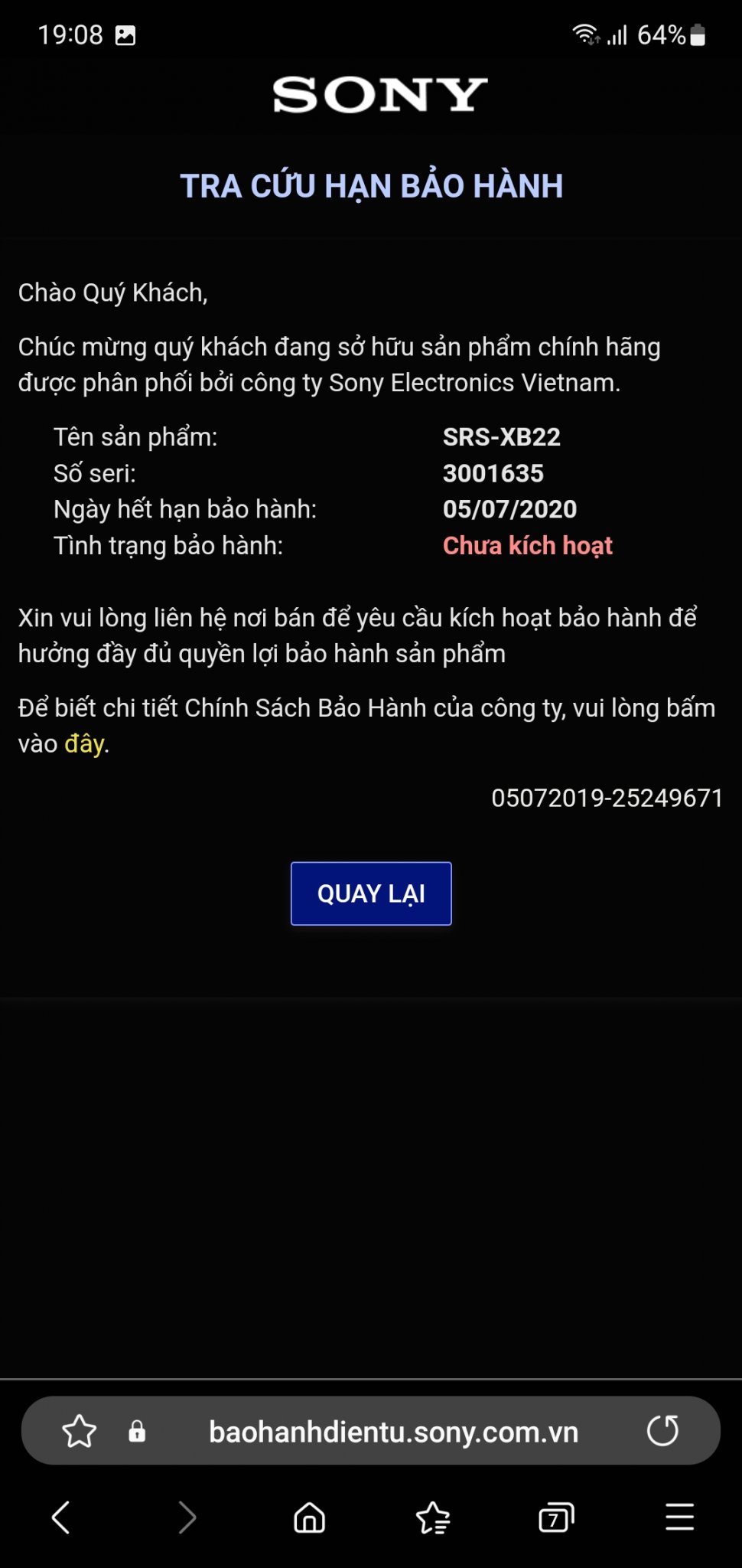 * Loa của em là hàng chính hãng Sony VN phân phối nên kiểm tra được thời hạn bảo hành bằng số Seri. Trên hệ thống Sony VN. Đã HBH, Chưa Sửa chữa, PK: Cáp.