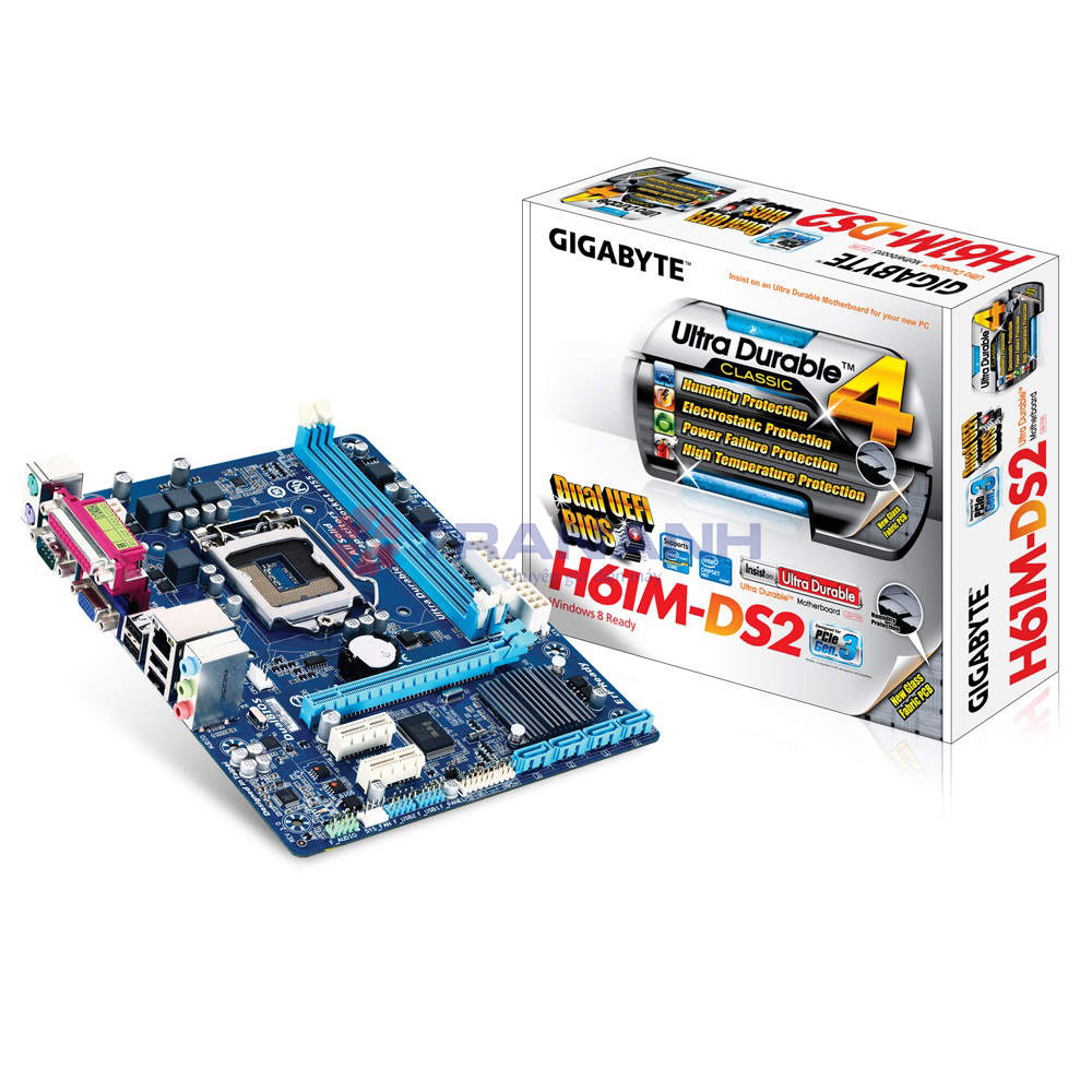 GIGABYTE™ GA H61M-DS2 (rev 5.0) - Intel H61 chipset - Socket LGA 1155 support 2nd Intel Core ixx (22mm) - tích hợp SOUND HD Audio 8-CHANNEL + VGA Intel® HD Core 2000/3000 with D-SUB + LAN Gigabit Realtek tốc độ 1000Mbps + 1*PCI-E x1 slot + 8*USB2.0 port + 1 x parallel port cổng LPT + 1 x COM series + 4x SATA2 3Gb/s connectors + RAM Dual Channel DDR3 2*DIMM upto 16GB RAM + Có khe PCI-E 2.0 x16