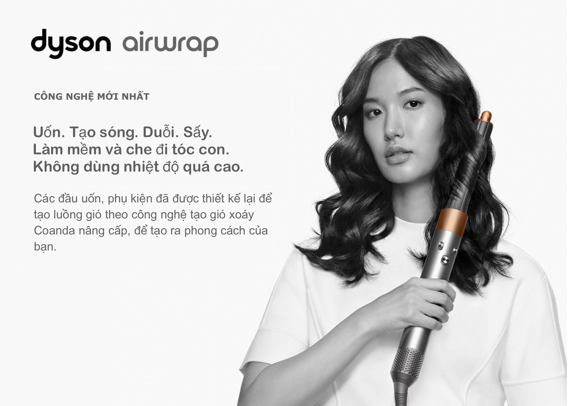 - Với các đầu uốn để uốn và tạo sóng theo cả hai hướng, lược để làm suôn và tăng độ phồng tóc cùng máy sấy tóc hiểu ứng Coanda đa chức năng để sấy khô, làm mịn tóc và ép tóc con.