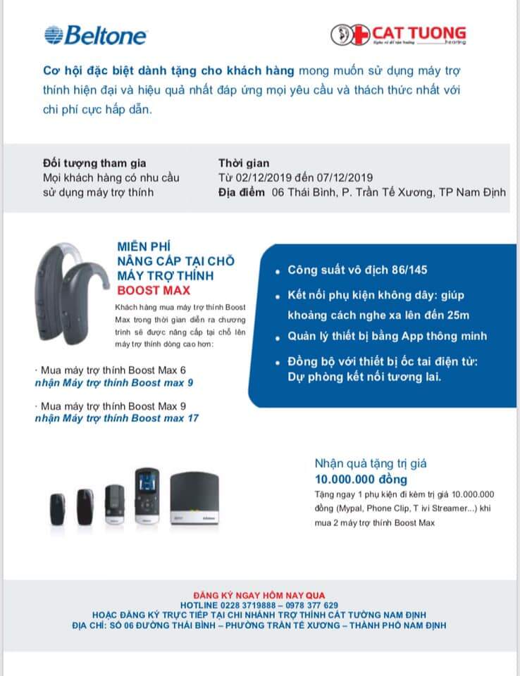 Beltone Boost Max ™ - Kinh nghiệm chăm sóc thính giác hoàn chỉnh nhất. Thách thức số một cho những người bị mất thính giác nặng đến sâu là nghe thấy lời nói trong tiếng ồn. >>>>> Beltone Boost Max được thiết kế cho những tình huống nghe khó khăn nhất. Với một loạt các tính năng: - Công suất vô địch thế giới 86/145, đáp ứng với cả những thính lực nặng - sâu. - Xử lý âm thanh tốt nhất 12-17 kênh, giúp tăng cường sự rõ ràng của giọng nói và giúp khách hàng giữ liên lạc với những người quan trọng nhất. - Kết nối phụ kiện không dây: Giúp khoảng cách nghe xa lên đến 25m. - Quản lý thiết bị bằng App thông minh, thiết kế cho Iphone. - Kết nối trực tiếp với Iphone, Android*: Nghe điện thoại, nhạc, điều khiển trực tiếp - Kết nối với các phụ kiện bên ngoài: Phone Link, Mypal Pro, TV link , Mipal micro - Thiết bị chuyên dành cho lớp học - Đồng bộ với thiết bị ốc tai điện tử: Dự phòng kết nối tương lai. Thông tin sản phẩm: - Hãng sản xuất: Máy trợ thính BELTON (Đan Mạch) - Xuất xứ: Đan Mạch - Đối tượng đeo máy: Trẻ em/ Người lớn/ Người già - Hình thức đeo máy: Đeo sau tai BTE - Thời gian bảo hành: 2 năm - Chế độ bảo hành, bảo trì: Bảo dưỡng, đo kiểm tra thính lực sau từ 3-6 tháng. ----------------------------------- Cơ hội đặc biệt dành tặng cho khách hàng mong muốn sử dụng máy trợ thính hiện đại và hiệu quả nhất đáp ứng mọi yêu cầu và thách thức nhất với chi phí cực hấp dẫn. Chương trình Miễn phí nâng cấp tại chỗ máy trợ thính Boost Max Khách hàng mua máy trợ thính Boost Max sẽ được nâng cấp tại chỗ lên máy trợ thính dòng cao hơn. Đơn vị tổ chức Hãng máy trợ thính Belton kết hợp cùng Trợ thính Cát Tường. Đối tượng tham gia Mọi khách hàng có nhu cầu sử dụng máy trợ thính. Thời gian từ ngày 2/12/2019 đến ngày 7/12/2019 Địa điểm: Trợ thính Cát Tường - Nam Định, số 06 đường Thái Bình, phường Trần Tế Xương, TP Nam Định. ĐĂNG KÝ NGAY ➤➤➤ XXX HOẶC XXX