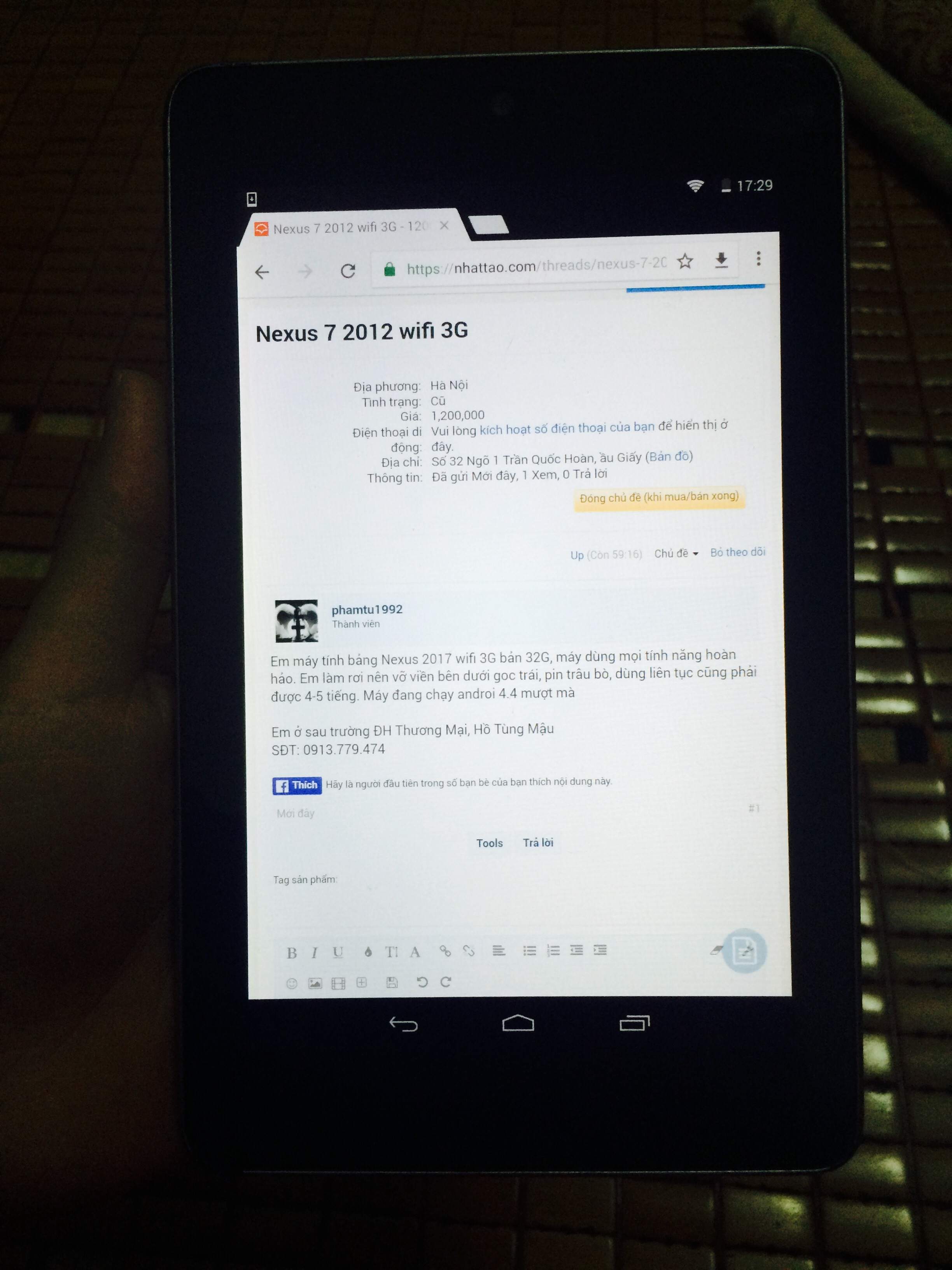 Em máy tính bảng Nexus 2012 wifi 3G bản 32G, máy dùng mọi tính năng hoàn hảo. Em làm rơi nên vỡ viền bên dưới goc trái, pin trâu bò, dùng liên tục cũng phải được 4-5 tiếng. Máy đang chạy androi 4.4 mượt mà
