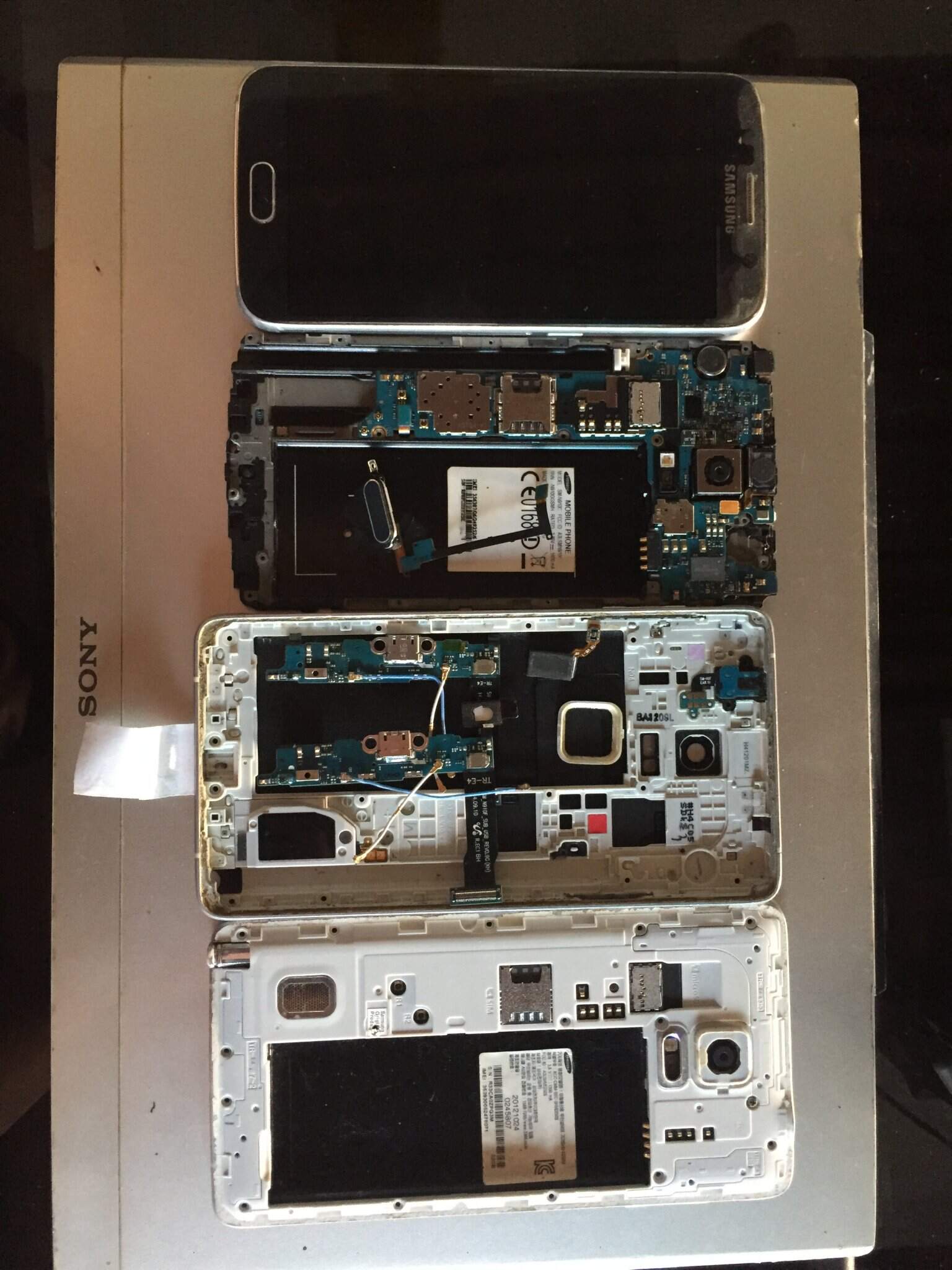 Dọn dẹp lại nhà cửa thấy còn một đống như sau: 1.S6 màn chết,main sống nhăn răng,gọi điện đến đổ chuông như thường. 2.Note 4 N910F main sống,màn chết. 3.Note 4 N910C main lỗi nguồn,màn chết. 4.Pin Note 4 mới.