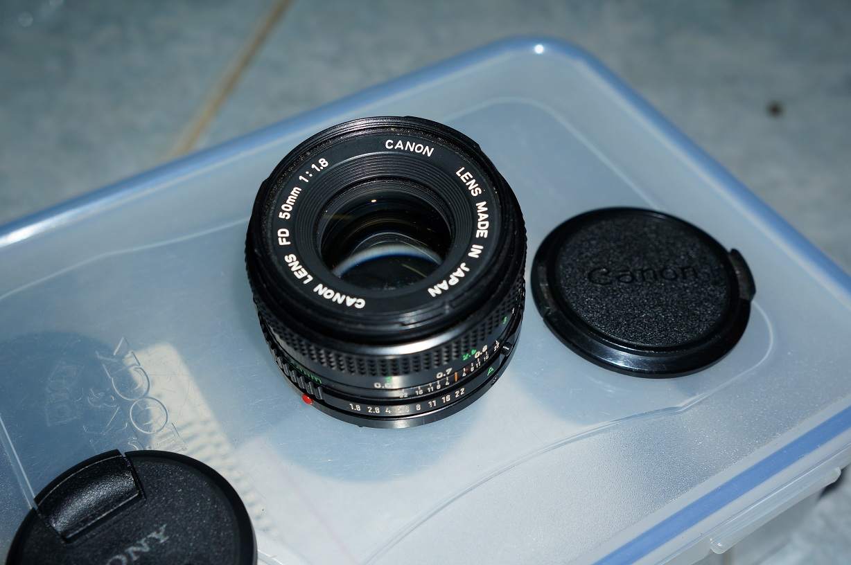 1-ống canon fd 50 1.8 giá 600k, kính trước sau không thấy trầy xướt. Có vài hạt bụi kèm theo. Xem lens tại gò vấp.