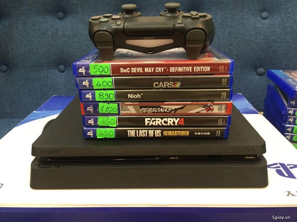 1. PS4 Slim 500GB Fullbox. Pk: 1 tay, dây sạc tay, dây nguồn, HDMI, hộp sách. Giá: 5tr4