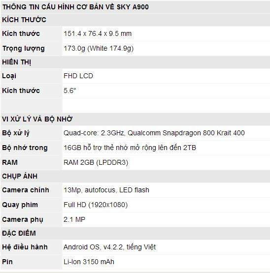 Về cấu hình, A900 được Pantech trang bị vi xử lý lõi tứ Snapdragon 800 tốc độ 2,3GHz, RAM 2GB, camera chính 13 megapixel, camera phụ 2.1 megapixel. Giao diện của Pantech ngày càng được trau chuốt, hiện đại và trang nhã hơn.