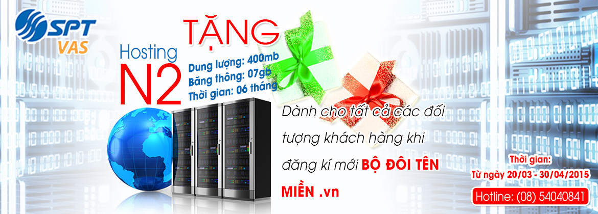 Hiện tại SPT đang có chương trình hỗ trợ từ nay đến hết tháng 4. Chỉ cần bạn đăng ký 2 tên miền .vn (.com.vn, .net.vn, .org.vn, .vn,.... miễn có .vn ) bạn sẽ được tặng 1 gói host miễn phí trong 6 tháng.