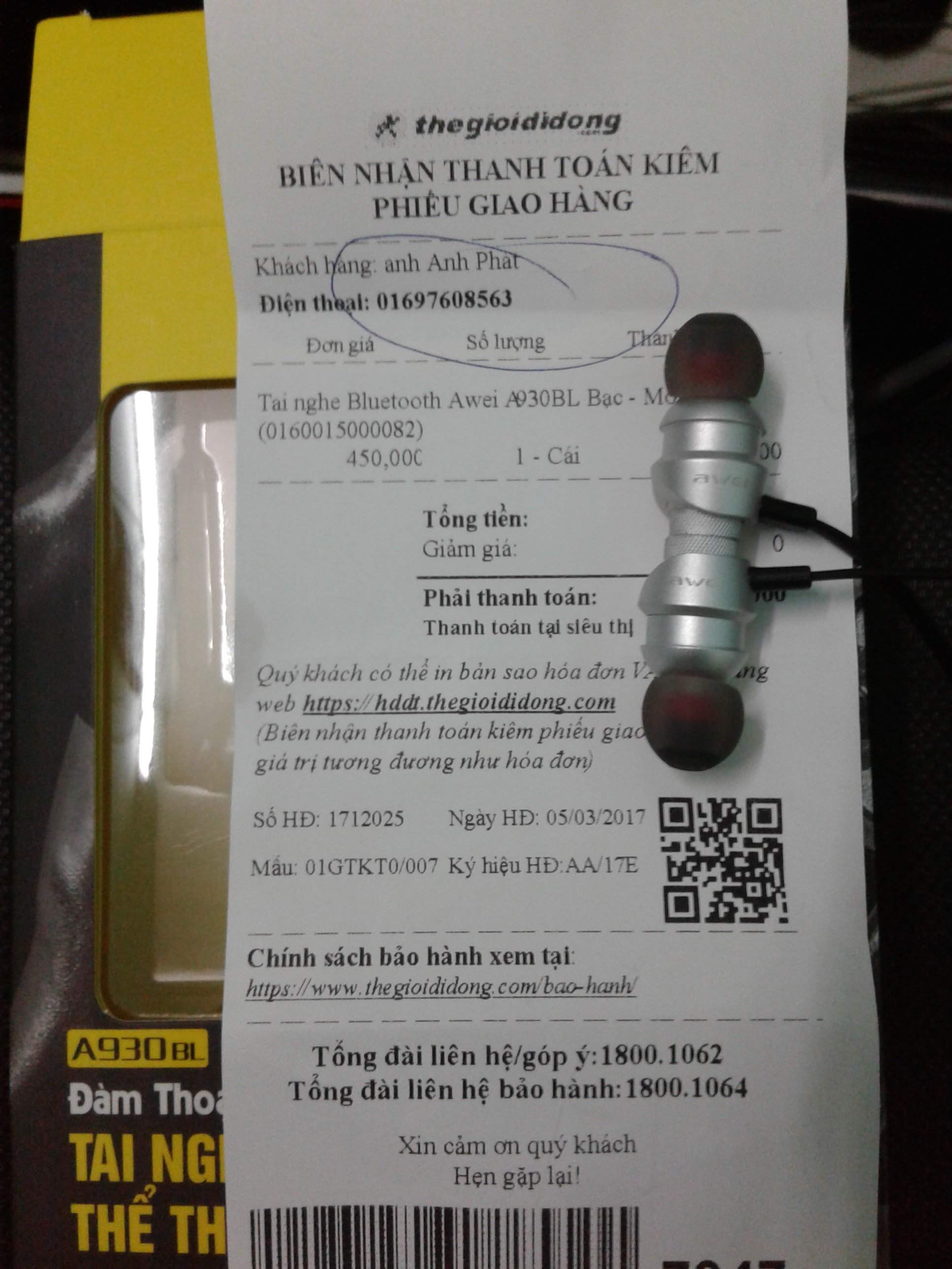 Bán tai nghe bluetooth Awei mới mua tại TGDD ngày 5/3/2017, đầy đủ phụ kiện, mới sử dụng 1 lần