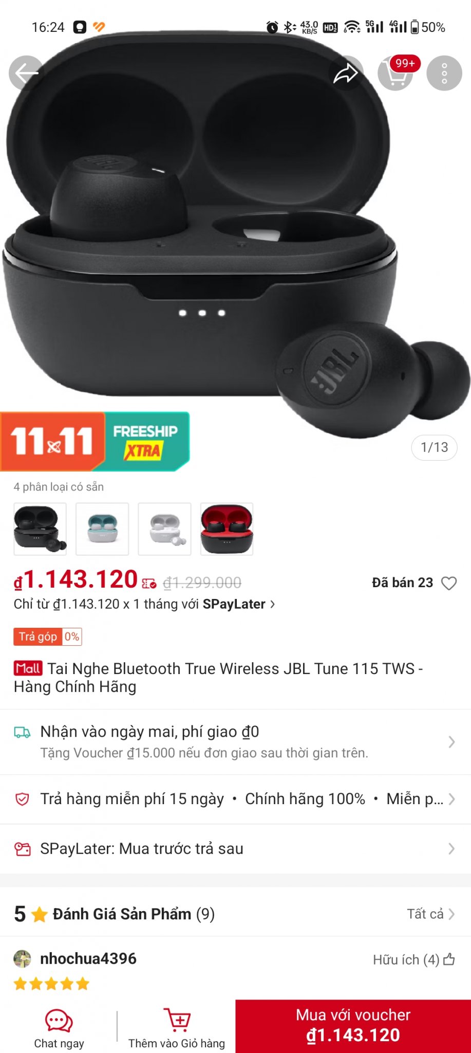Có cái tai nghe JBL Tune 115 TWS mình đi sự kiện mới trúng thưởng được. Shopee đang bán 1143k, mình pass lại 800k nhé.