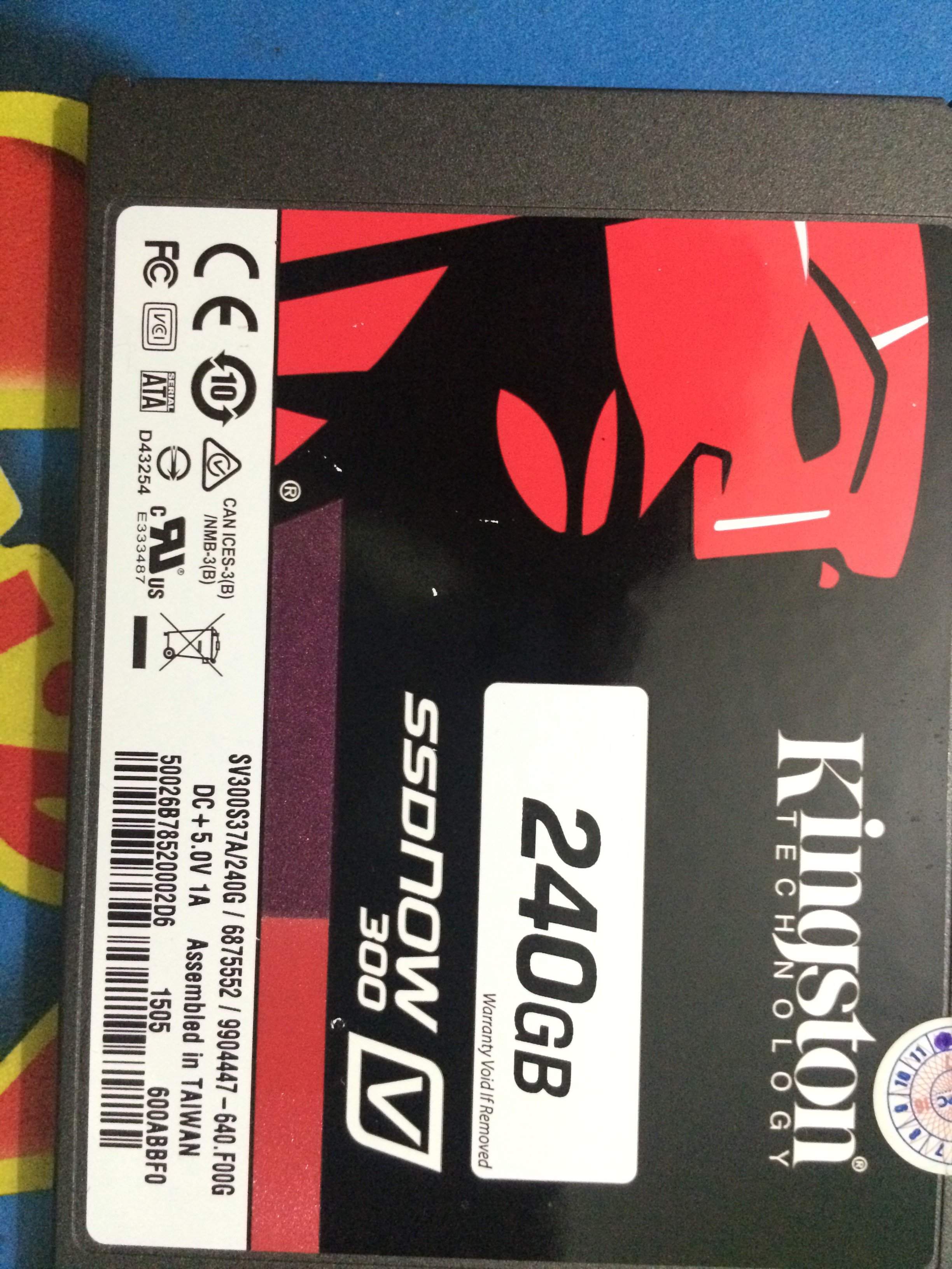 1: ổ cứng SSD kingston v300 dung lượng 240 Gb.Còn bảo hành tới tháng 12-2018 .Tem chính hãng của Công ty Cổ Phần Máy tính Vĩnh Xuân (SPC)