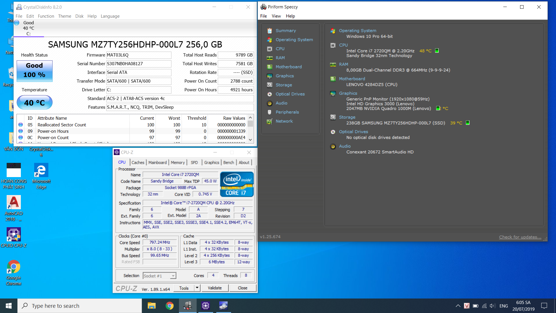Cpu i7 2720QM/ 8g ram/ SSD samsung 256g/ Vga Quadro1000m + HD3000/ Màn full HD 15.6 sáng đẹp ko điểm chết. Pin dùng đc 1h.