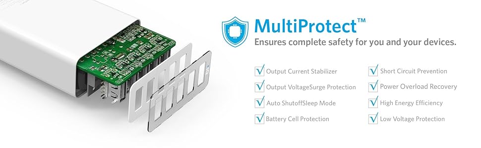 Không phải tất cả các cổng sạc được tạo ra giống nhau. Cổng tiêu chuẩn được sử dụng hiệu quả với các thiết bị đặc biệt, giống như Apple hoặc Android, thường có sự khác nhau về dòng điện trên cục sạc. Nhưng với công nghệ PowerIQ ™, mỗi cổng sạc thông minh sẽ tự nhận dạng điện thoại của bạn để phù hợp với "ngôn ngữ sạc duy nhất và riêng biệt" của thiết bị đó. Vì vậy, Với bộ sạc hàng đầu của Anker dùng công Công nghệ PowerIQ bạn có thể tận hưởng khả năng tương thích tối đa mà không giới hạn tốc độ sạc pin vào thiết bị của bạn, cũng như không phải lo lắng về việc sạc quá dòng.