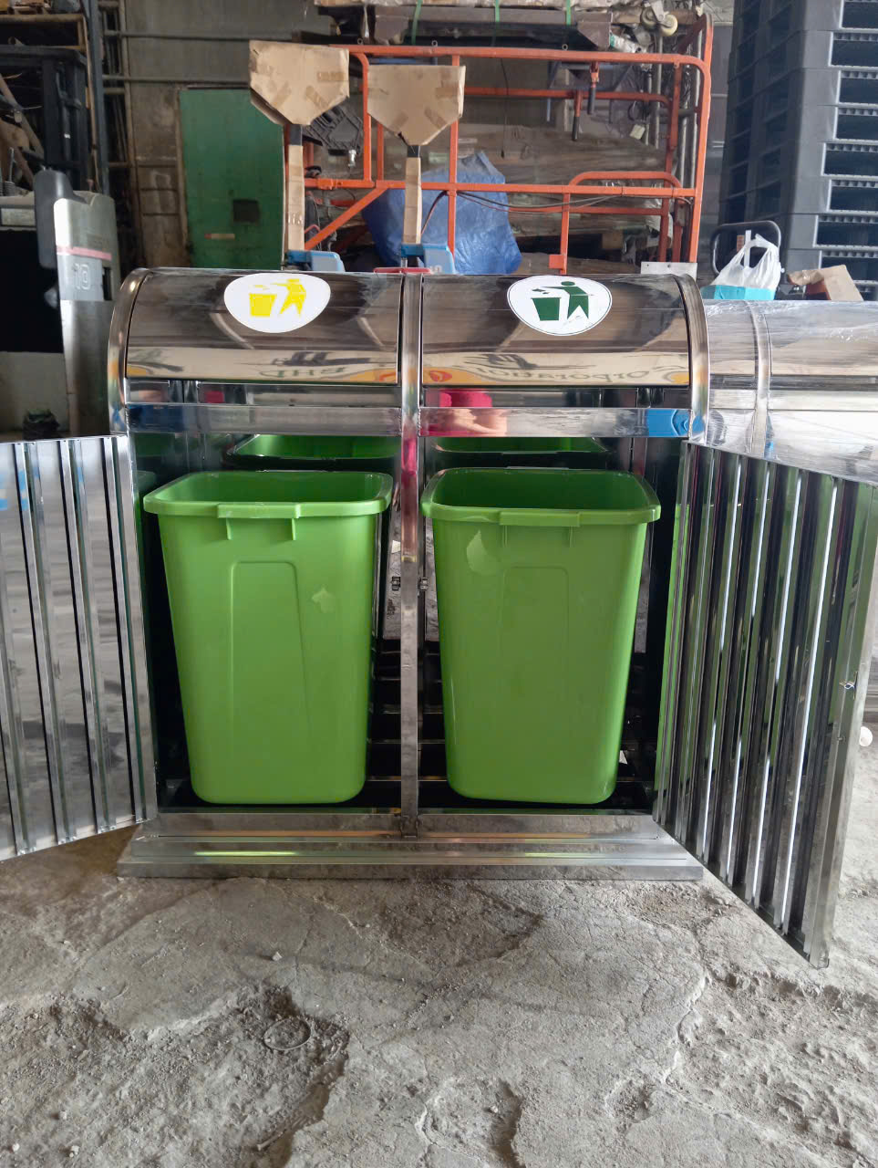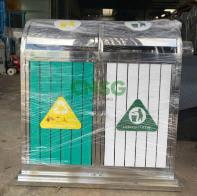 - Thùng rác Inox 2 ngăn thường được đặt ở công viên, trường học, trung tâm thương mại, bệnh viện, khu đô thị,…