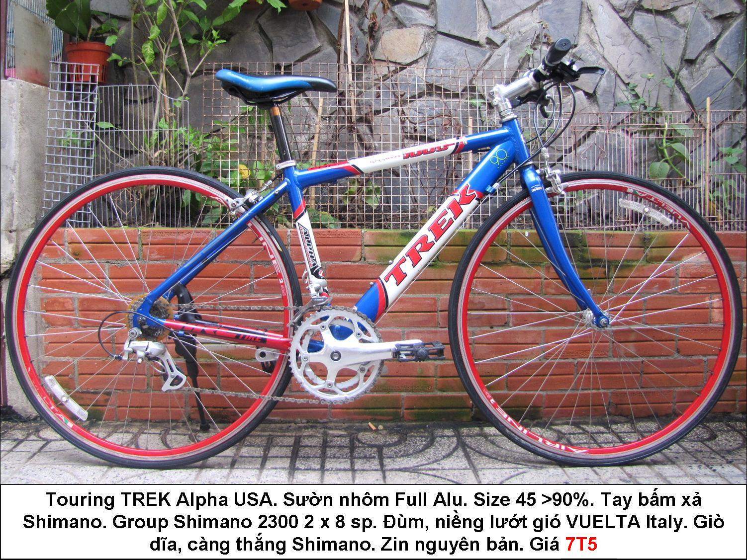 Touring TREK Alpha USA. Sườn nhôm Full Alu. Size 45 >90%. Tay bấm xả Shimano. Group Shimano 2300 2 x 8 sp. Đùm, niềng lướt gió VUELTA Italy. Giò dĩa, càng thắng Shimano. Zin nguyên bản. Giá 7T5